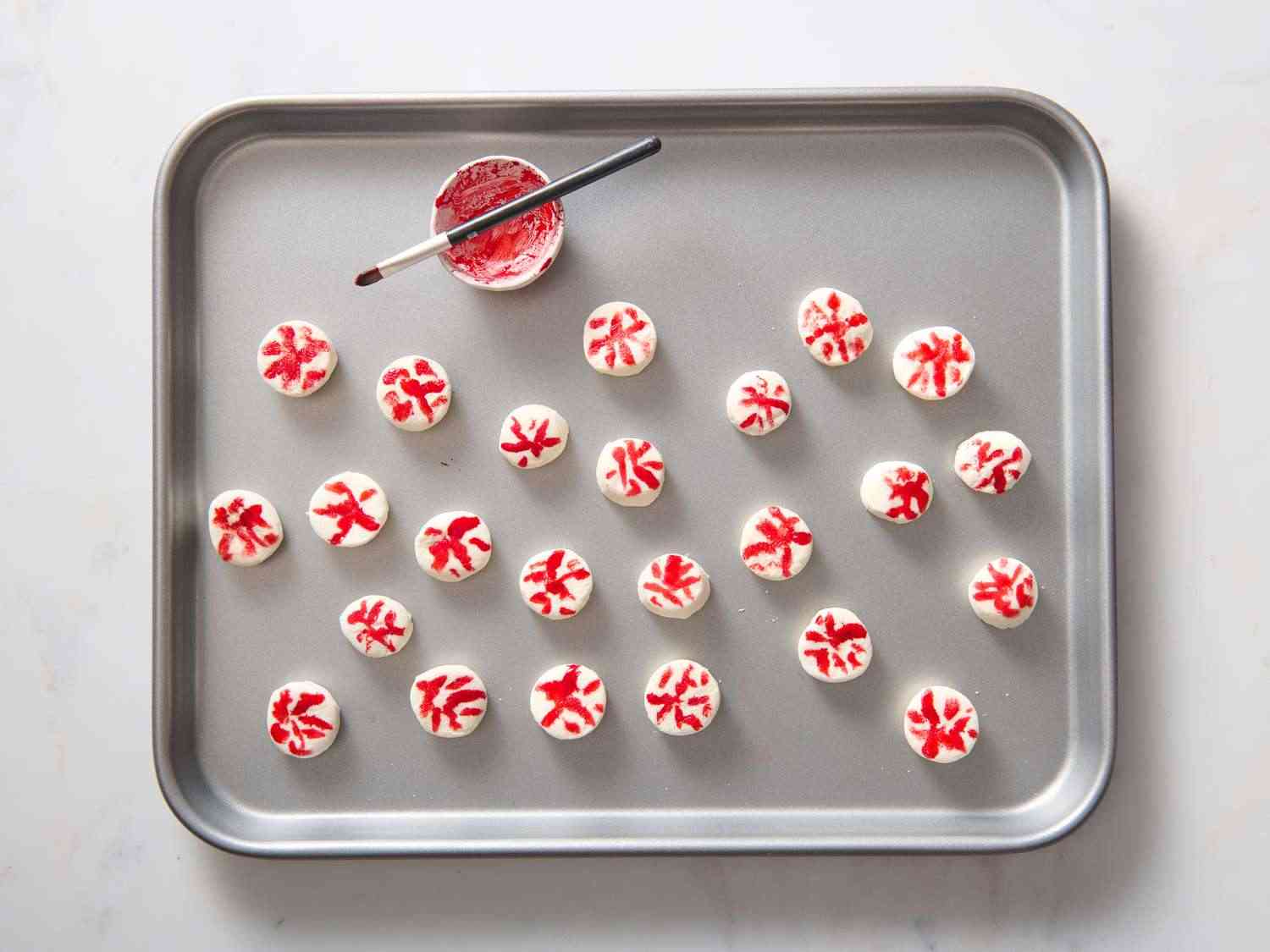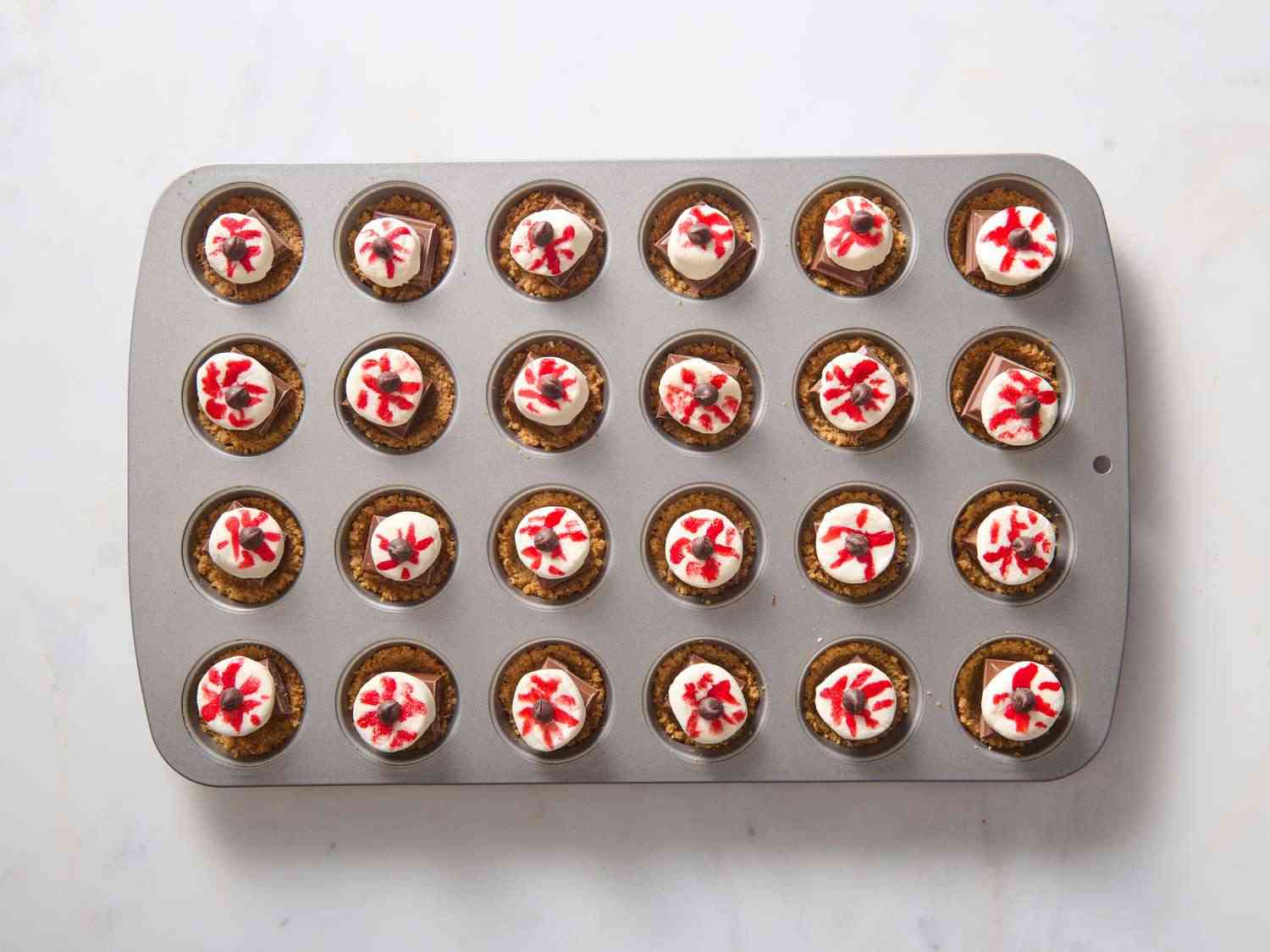 - Step 5:Paint red circles and lines to resemble blood-shot eyes on top of each marshmallow using red food coloring. Allrecipes/Julia Hartbeck